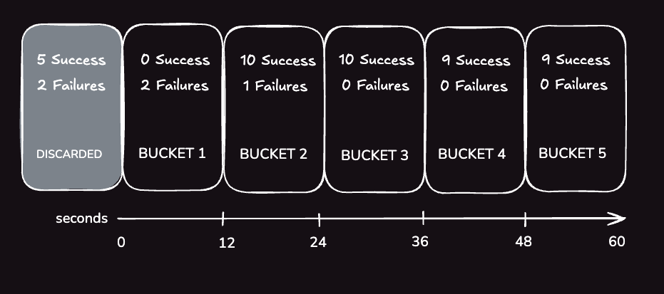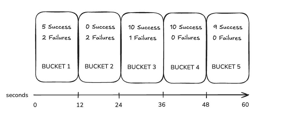 After 60 seconds have elapsed, the circuit breaker has collected a full window of data across all 5 buckets, as illustrated in the diagram below: